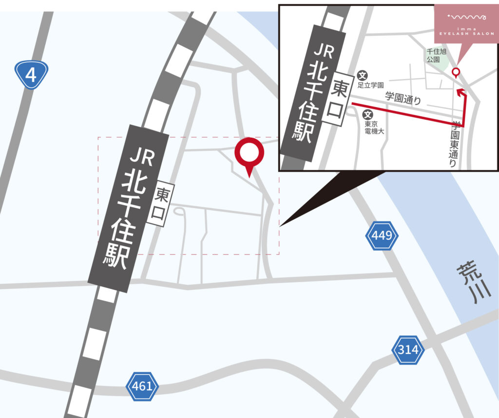 東口を出てまっすぐ学園通り商店街の中を突き当たるまで直進。突き当たりを左折、少し歩くと道が4つにわかれるので左手側、一番手前の道を左折。すぐに道沿い右側の一軒家玄関のimmaの看板が目印です。
